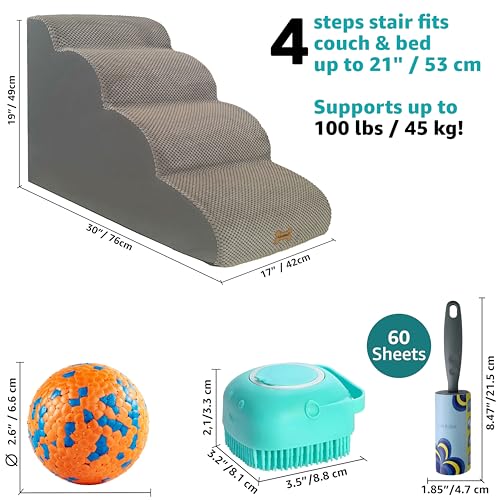 - β γπ£πππππππ‘πγ Dog Ball, Bath Brush, Lint Roller and Anti-Slip dog paw-shaped cover, all bundled with the dog steps for bed and couch. γππππ§π¨π₯ππ¦γ30″ D x 17″ W x 19″ H with 30D foam dog steps for high bed support up to 100 pounds, aiding dogs to access 21 inch bed or couch. ADD TO CART.