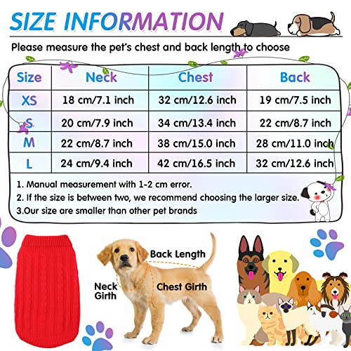 Size details: the sweaters are small in size and not suitable for large dogs; Measure around the widest point of your dog’s chest and rib cage area to determine your dog’s girth and leave 2-3 fingers space to achieve nice fit and comfort; Please refer to the size chart before ordering