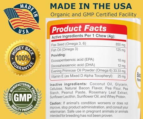 Omega for dogs – Get a fish oil omega 3 dogs soft chewable tablet dogs love to eat!Omega 3 soft chews for dogs is a great-tasting omega 3 6 9 for dogs fish oil dog supplement for coat and skin conditions, itchy skin, flaking, and hot spots. Our omega skin and coat chews for dogs protect your dog’s heart, immune system, and joints with omega 3 fish oil dogs like.Omega 3 oil for dog skin helps your dog feel better with powerful dog supplements for skin and coat and fish oils for dogs. An omega 3 supplement for dogs gives skin and coat protection and increased joint mobility, both important as your dog ages.Your dog will absolutely love our tasty salmon flavored omega 3 dog anti itch chewable dog shedding supplements. It’s a dog salmon oil supplement of salmon bites for dogs.Dog oil supplements for skin and coat – shiny coat, less itchingOur omega 3 chews dog supplements for itchy skin restore natural balance with a complete omega 3-6-9 supplementThis skin supplement for dog anti shedding supplements for dogs provide optimal heart, immune system, hip and joint support.Fish oil pills for dogs dog skin supplement for a shiny coat and healthful skinTargets arthritis joint pain reliefHelps reduce joint discomfortOur vet recommended omega 3 dog supplements for dogs contain omega fatty acids for dogs.This omega 3 oil for dogs has no shrimp, crab, shark, avocado – our dog fish oil pills won’t hurt your petOur fish oil chews for dogs made in the usa in a gmp facility, 3rd party verified for purityNo refrigeration needed omega fish oil for dog skin and coat.An omega 3 fish oil dog skin supplement in dog omega oil chewable tablets your pet will love.Massive improvement in your dog with our omega dog chews in 28 days or we’ll take care of it, no need to return the bottle.Do not wait, see the button at the top of this page to help your dog feel better now.