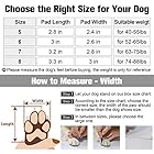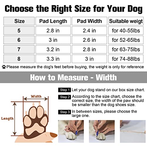 SIZE 5: 2.4”x2.8”(W*L) ; SIZE 6: 2.6”x3.0”(W*L); SIZE 7: 2.8”x3.2″(W*L); SIZE 8: 3.0”x3.3″(W*L) . Comes in a 4-pack with exquisite packaging, easy to store. In addition the back of the dog shoe box has a size chart, so it is easy to measure the size of your pet before wearing. Please be sure to measure the width of your dog’s paws carefully, weight can only be used as an additional reference.