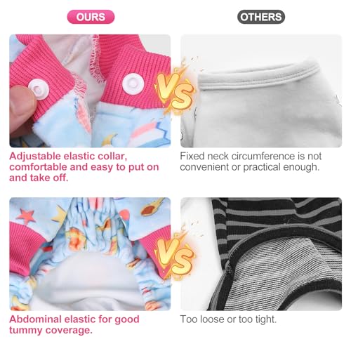 Easy to Put on and Take off: Our pet pjs are delicately designed with convenient wearing and removal methods. The elastic collar and hidden buttons make it easy for you to quickly put on or take off the pet onesies for your pet.