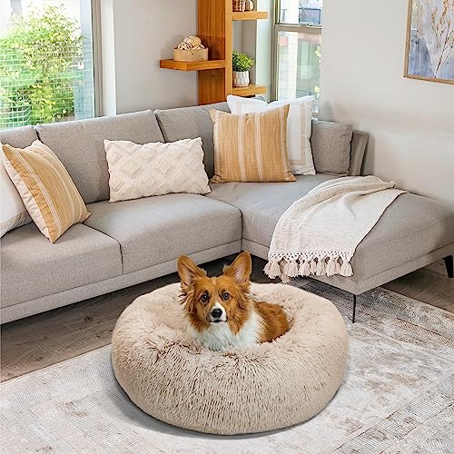 CALMING COMFORT DESIGN; round shape and 7in tall bolster make this the perfect bed for cuddling up and burrowing, helping to calm dog anxiety and provide a sense of security while your pet sleeps