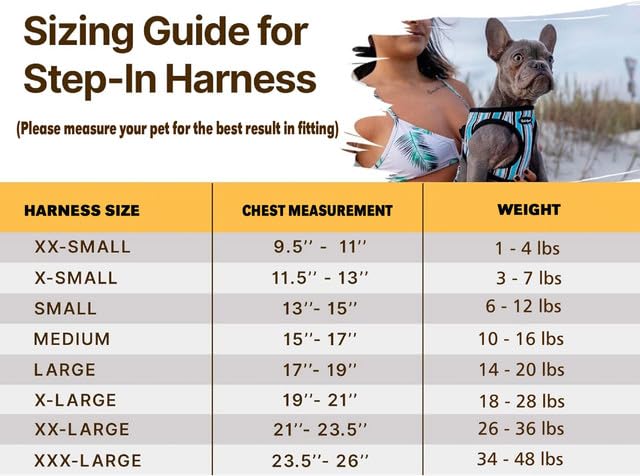 5.) EASY TO USE: Simply Step in, Wrap and Buckle for a safe, secure fit. This step in dog harness goes on in seconds, and it uses a heavy-duty buckle with adjustable strap to ensure your pup is quickly ready for their walk without any complicated setup. ** IMPORTANT INFORMATION: ALL NEW AND RETURNING CUSTOMERS, PLEASE REVIEW THE SIZE CHART FOR PROPER FIT