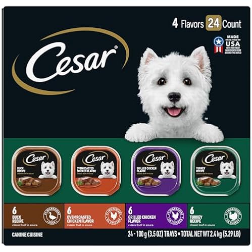 Give your dog a scrumptious meal to start and end the day right with CESAR Classic Loaf in sauce Breakfast & Dinner Mealtime Variety Pack Wet Dog Food Trays. Made with Beef or US Chicken as the #1 ingredient, our savory dog food gives your pampered pooch a meal just like yours — with complete and balanced nutrition made just for them. Breakfast and Dinner dog food served in convenient trays with no-fuss, peel-away freshness seals, the CESAR Brand makes mealtime easy at any time of day. Best of all, our gourmet wet dog food uses ingredients formulated to meet nutritional levels established by the AAFCO dog food nutrient profiles for maintenance.
