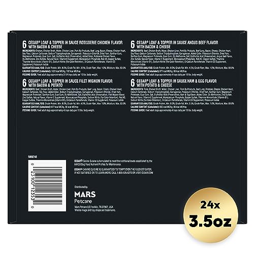 Dogs with sophisticated palates will enjoy a rich culinary experience with CESAR Wet Dog Food. From large to small dogs, indulge your pampered pooch with savory dog food featuring US Chicken, Beef or US Pork as the #1 ingredient, and rotisserie chicken, filet mignon, angus beef, and ham & egg flavors that make their mouth water and tail wag. CESAR Dog Food delights with a tantalizing texture, and is enhanced with vitamins and minerals for complete and balanced nutrition. Served in convenient trays with no-fuss, peel-away freshness seals, CESAR Adult Dog Food makes mealtime easy. Our gourmet wet dog food also uses ingredients formulated to meet nutritional levels established by the AAFCO dog food nutrient profiles for maintenance.