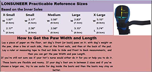 Practicable Reference Size of Large: L 3.15″ x W 2.83″. Lonsuneer soft dog boots are reliable paw protectors for dogs, capable to protect paws indoor and outdoor, and also suitable for bandages. The boots are comfortable, flexible, lightweight and hand washable. Please measure across the whole paw pad to get the measure of paw width and length. These boots are relatively flexible and roomy, so a snug fit is better. If your dog’s paws are in between 2 sizes and if you’ve chosen the larger one, you could kindly try to use socks for dog inside the boots and then the boots may stay on better. Kindly Attention: Though the soles are waterproof, the boots can’t be applied in deep water or in heavy rains, because there may be water seepage through sewing needle holes or through mesh fabric.
