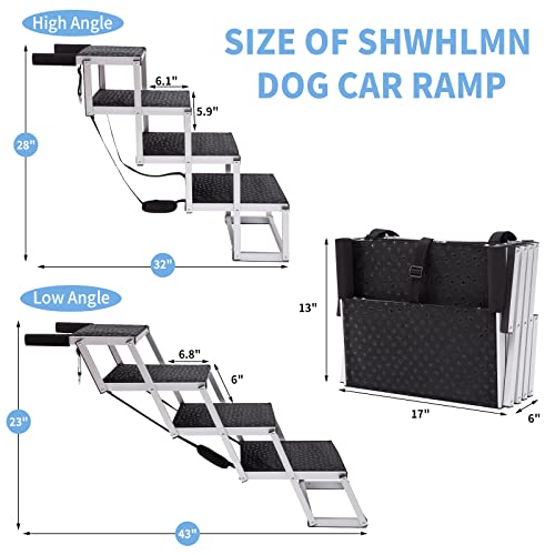 【Adjustable Dog Car Stair】: Wider and more stable than a ramp, the open adjustable height from 23″-28″, adjustable length from 32″-43″. The dog stairs for cars can fold down into a convenient size of 17*13*6 in, We are additionally equipped with an upgraded high-quality waterproof Oxford cloth bag, Not only can you protect your car from scratches, but also make it more comfortable carrying and storage.