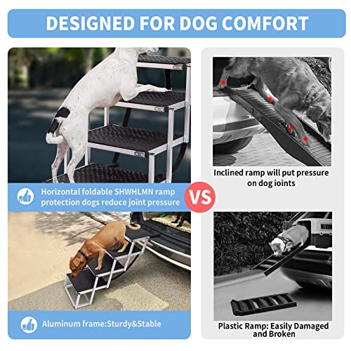 【Designed for Dog’s Comfort】: As your dog climbs the steps, the extended stair depth and gentle incline put less pressure on the dog’s front and hind legs, providing a safe and comfortable climbing platform for short legged, older, handicapped or injured dogs. Use our dog stairs to help your best friends in and out of your car and easily portable, Suitable for travel, picnics, camping, home outdoor necessities.