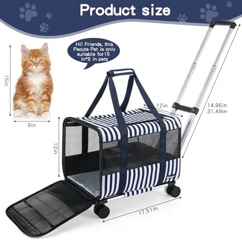 Cat Carrier with Wheels Airline Approved: This dog carrier with wheels is designed to meet TSA standards, when the wheels are removed, this dog carrier will fit under most airline seats, please inquire local airlines. Pet cage dimensions: 18″L x 12″W x 12″H without wheels. Recommended for Small and medium-sized cats and small dogs pets up to 20lbs.