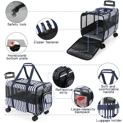 Well Ventilated: This rolling pet carrier is equipped with 4 breathable mesh windows, 2 openings in different directions to easily put your lovely pets in and out. The 2 skylights on the top allow pets to poke their heads out, providing plenty of airflow and visibility, allowing you to check on your pets at any time.