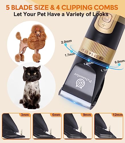 🐈【Professional Pet Grooming Tool 】:The 5 precisely adjustable (0.8mm/1.1mm/1.4mm/1.7mm/2.0mm) trimmer blades and the 4 detachable (3mm/6mm/9mm/12mm) durable clipping combs are applicable for different types of pet hair, including thick and long hair. With a set of high quality stainless steel beauty scissors and combs, you can design various hairstyles for your furry friends.