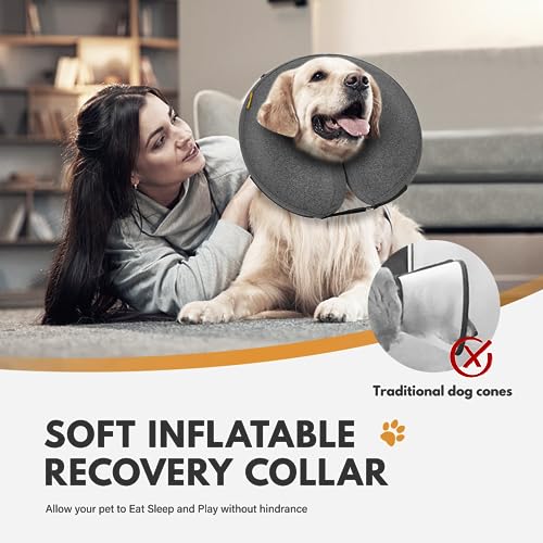 RECOMMENDED SIZE – Dog cones for XL Large dogs fit a neck circumference of 18″-24″ . Especially for German shepherd, Labrador,Rottweiler, and Golden Retriever. [TIP: MEASURE YOUR PET’S NECK CIRCUMFERENCE AND BUY A MORE APPROPRIATE INFLATABLE COLLAR! ] Premium Service: We are committed to providing safe inflatable pet collars for every pet owner. If you have any questions, please feel free to contact us, and we sincerely wish your pet a speedy recover.