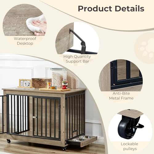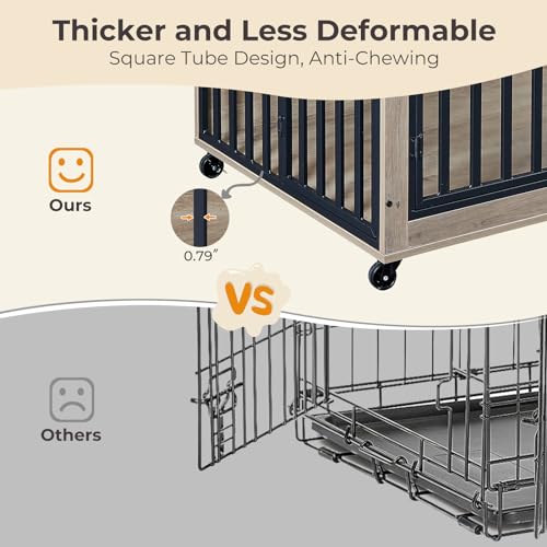 【Bold Square Tube Design】The wooden dog crate furniture combines high-quality particle board and 0.79-inch thick iron rods to guarantee long-lasting durability and stability, which can effectively prevent dogs from chewing and enhancing durability. The upper surface has a maximum weight capacity of 150 pounds and offers a spacious tabletop for placing pet supplies and various decorative items.