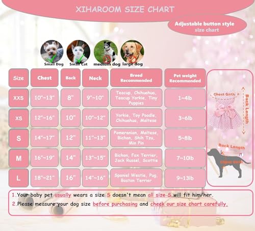 Pre purchase instructions: About the FabricThe dress is made of super thin,light and soft cotton-containing fabric,No restraint,as comfortable as not dressed,designed for summer&for cute adornment,not for warm.(Dark floral fabric is thicker, light floral fabric is thinner) About the StylesCloak style,single-layered floral skirt,chest and neck are fixed with Velcro,more convenient to put on and take off. About the Size Size is Measured by hand,with a picture of the measurement,please allow 1cm error. About the Bow-knotBefore update the Bow-knot is glued,after upgrade the bow is sewn on the skirt.The bow size of skirts of different patterns and sizes is the same! About our services If you are not satisfied, before you leave the Negative/Neutral feedback,contact us and let me know that,we will resolve the problem till you satisfied. How to measure your dog? Step1. Determine what type of the clothes you will purchase.For tops (such as dresses,shirts and coats without legs),the chest girth is the most important, please be sure the chest of a clothes can fit your pet. Step2. Chest girth:Measure the chest at its widest point all the way around. Step3. Back length:Measure length of pet’s back from the base of the neck to the base of the tail.(Excluding the tail). Warm tips 1.Our clothes are NOT suitable for large breeds of dogs. 2.Take each measurement a bit loosely. 3.Any of the measurements are ‘between’ two sizes,please size up. 4.Your baby usually wears size S doesn’t mean all size S will fit him/her.Different designers and manufacturers use their own size charts. 5.If your pet is under one year old and still growing,please take this into consideration.