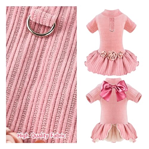 This cute princess bowtie dress is made of polyester, soft and breathable. There is a sturdy metal D-ring on the back to hold the puppy to prevent it from running around. s rope is made of nylon, soft and durable.