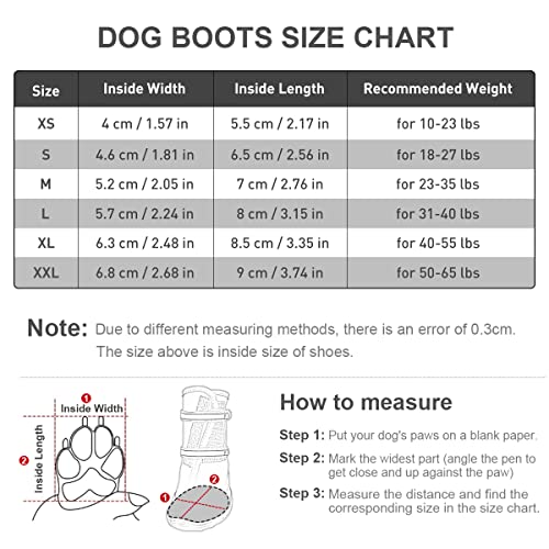 【Measurement & Size】Measure paw width and length for the best fit. If the paw is in-between two sizes, select the larger size.* How to measure? 1, Let your dog stand on a piece of paper. 2, Fix dog’s paw firmly on a piece of paper. 3, Mark 4 sides of the paw on the paper and measure the length and width.* If you don’t know how to choose the right size, tell us the length and width of the paw. We come to help you choose.