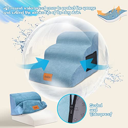 - 【Waterproof Cover】- Compared with other dog stairs, our dog stairs have a built-in waterproof layer. The zippers on the cover are also designed to be waterproof. They can protect the sponge from getting dirty. The sealed zippers slide easily and are very durable. The zipper design makes the dog step easy to remove. The cover is machine washable. A net bag on the side of the cover can hold pet’s toys and is easy to store.