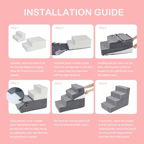 - Note: Our dog stairs are vacuum-packed and need to sit for 24 hours after opening the memory foam package until the stairs are fully extended and covered with cloth covers.