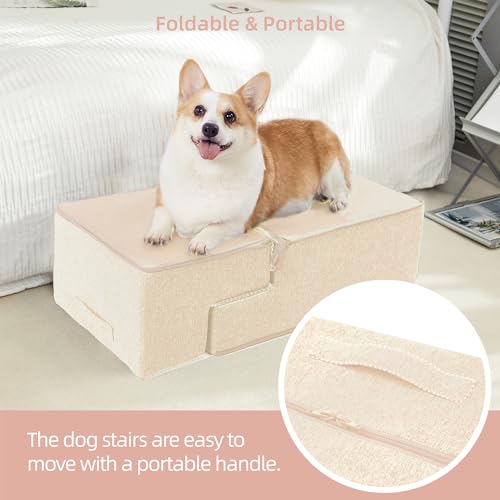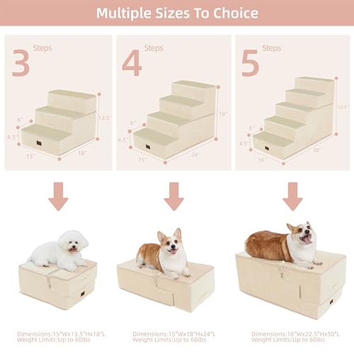 - 🐶VERSATILE USAGE & STYLISH: This dog stair has 3 steps, 4 steps and 5 steps to choose. Our 3-step dog stairs are only suitable for sofa and low beds (no higher than 18inch). If your bed is not too high or low which is medium height, please choose 4-step dog stairs (no higher than 23inch).And 5-step dog stairs for high beds are more suitable (no higher than 27inch). The dog stair for couch feature an elegant grey color that blends seamlessly with any interior decor.