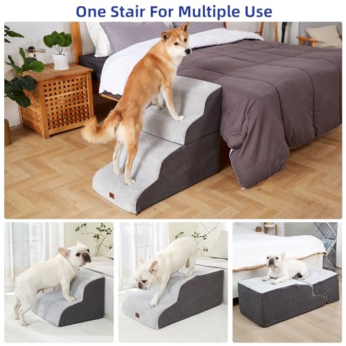 - DETACHABLE DOG RAMP FOR HIGH BED-Our dog ramp for bedside comes in 2 parts not only can be a dog/cat stair for different heights but also has a tunnel for small pets playing. 4steps can be detachable into two 2-tier pet steps, Spliced into a large cat/doggie bed. 5steps can be detachable into a 3-tier pet steps, a 2-tier pet steps, a large cat/doggie bed.