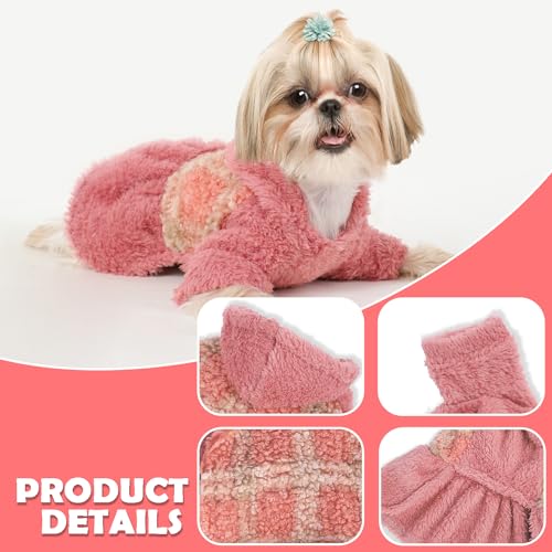 Winter dog dress, cute warm fleece dog hooded sweater, for small dogs girl, pink plaid puppy dresses clothes for chihuahua yorkie,cat apparel
