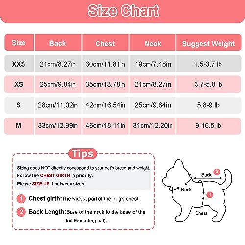 1. FOR SMALL DOGS OR CATS. The puppy clothes available in a range of sizes(XXS-M) for the paw-fect fit. Suitable for 1.5-16.5lb dogs. Sizing does NOT directly correspond to your pet’s breed and weight. BE SURE TO MEASURE THE CHEST AND BACK FOR BEST FIT.(Please priority follows the chest size. )