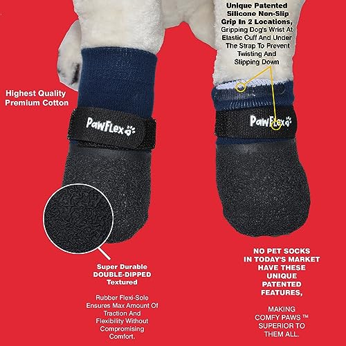 These unique high-quality features allow for more durability while still maintaining stretch and comfort. PawFlex Comfy Pawz are the only boots and socks with Silicone nonslip grip on inside of boot/Sock which maintains its hold on your pet’s paws. NO OTHER SOCK OR BOOT HAS THIS PATENTED FEATURE.