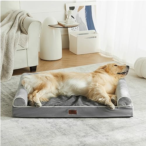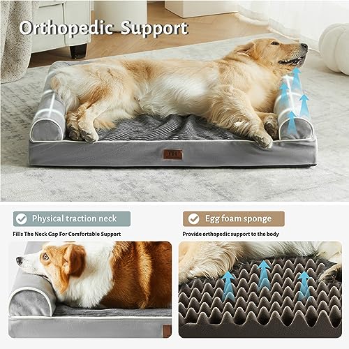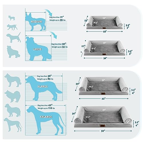 [DOG FRIENDLY DESIGN] : The U-shaped design of the sofa dog bed is surrounded by 3 side bolsters that provide support for your dog’s head and neck, promoting correct spinal alignment and allowing your dog to sleep in complete relaxation. The pet bed’s sleeping surface is made from stretch flannel for extra comfort and security.[COMFY EGG-CRATE FOAM] : The orthopetic dog bed uses high-density egg crate foam, which can evenly distributes dog’s weight and provide support to relieve pressure, breathable material to help keep your pet from overheating at night.