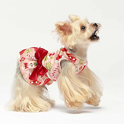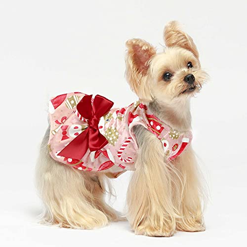 DRESSY CHRISTMAS. Pinky dress with cute Christmas elements printing, a red ribbon bow bringing extra holiday senses. Moving around with the hem for more movements to keep great memories.