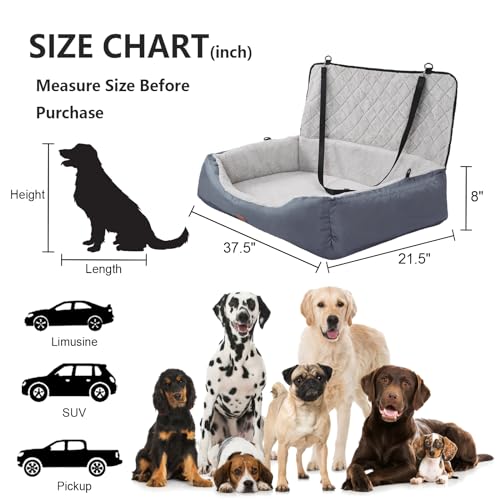 Large Dog Seats Size: 37.5″”(L) X 21.5″”(W) X 8″”(H). This dog car seat for medium dogs is suitable for large/medium dogs under 55 lbs or two small/medium pets under 20 lbs. Suitable for almost all types of vehicles, cars, trucks, SUVS.