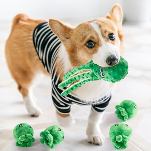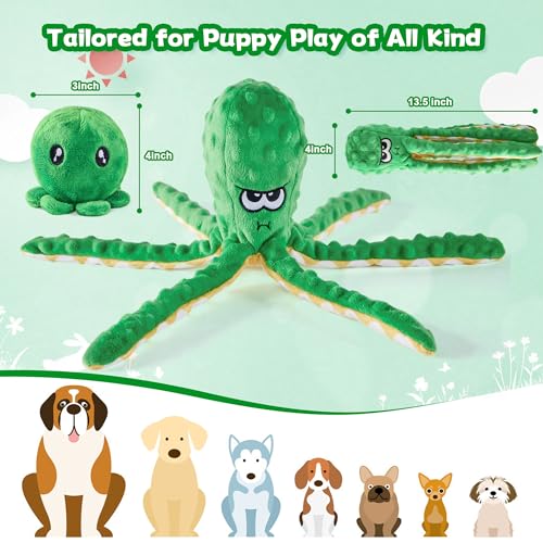 đăIRRESISTIBLE SQUEAKY DOG TOYSăInside the head of these plush tough dog toys hides an irresistible squeaker, perfect for capturing your dog’s attention. Not stopping there, we’ve added crinkle paper to the dog toys for large dogs’s tentacles, providing even more entertainment. The squeaker produces just the right pitch to ignite your dog’s enthusiasm, while the crinkling tentacles turn it into an engaging tug-of-war plaything for large dogs and even puppies.
