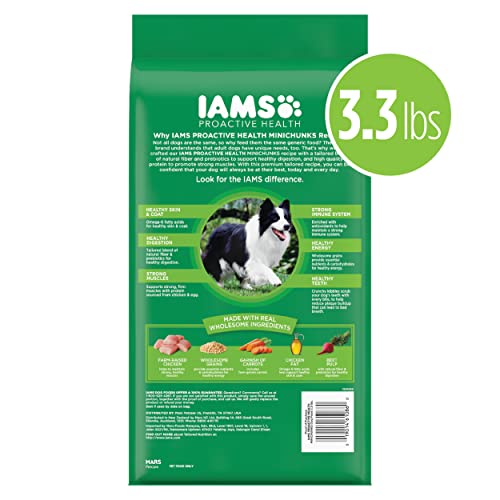 Contains one (1) 3.3 lb. bag of IAMS Adult Minichunks Small Kibble Dry Dog Food with Real Chicken