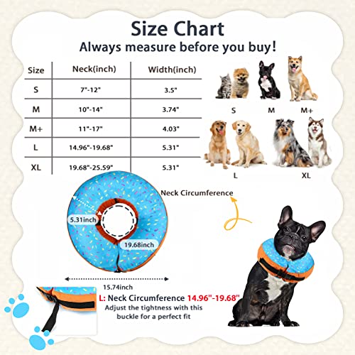 5 SIZES TO CHOOSE:There are 5 sizes to choose from the dog cone. S:For Neck:7-12Inch,M:For Neck:10-14Inch,M+:For Neck:11-17Inch,L:For Neck:14.96-19.68Inch,XL:For Neck:19.68-25.71Inch