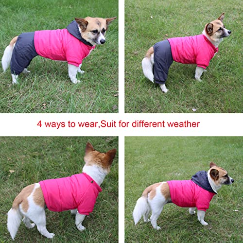 4 ways to wear:dog coat with detachable hat by metal snaps, detachable hind legs by zipper,suitable for different weather in winter;