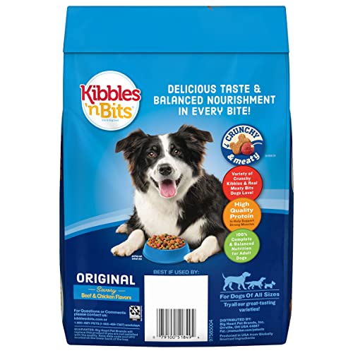 Kibbles ‘n Bits Original dry dog food is full of flavors and benefits that will get your dog’s tail wagging. Our signature mix of crunchy kibble and meaty bits is made with high-quality protein and irresistible beef and chicken flavors for delicious nourishment in every bite! This adult dog food offers 100 percent complete and balanced nutrition that you can feel good about serving your dog every day. Plus, it’s produced in the USA from globally sourced ingredients. So, make your dog’s life even more tasty and fill their bowl with this satisfying meal from Kibbles ‘n Bits.