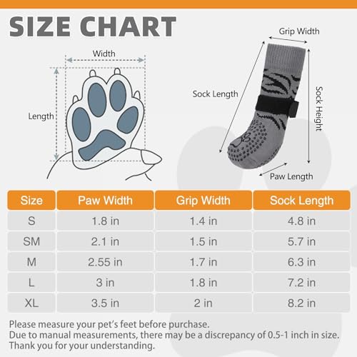 Size SM: Foot width 2.1 inches Sock length 5.7 inches Grip width 1.5 inches. Please make sure to measure your pet before purchase.