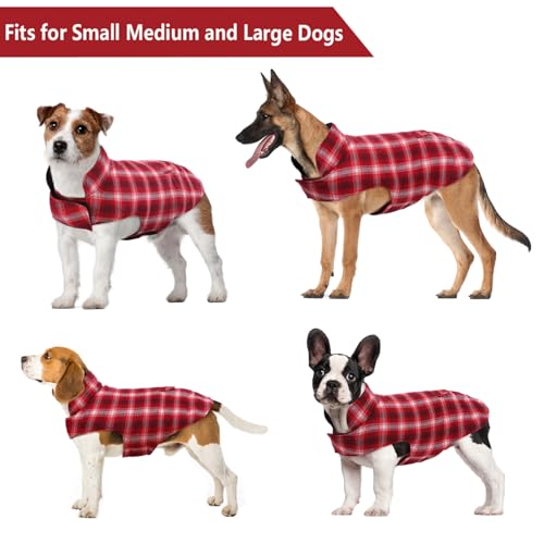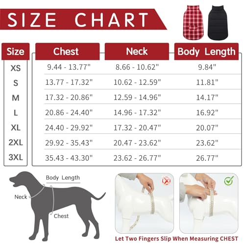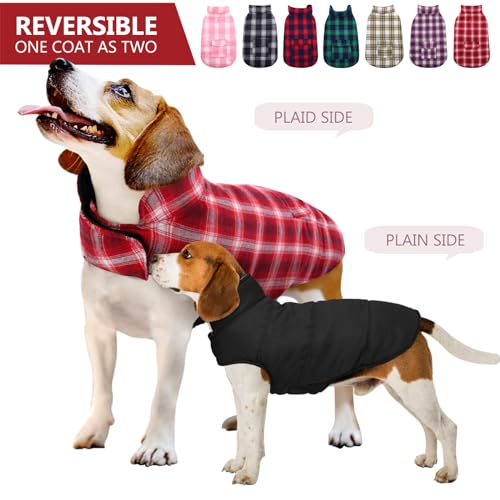 Reversible Dog Clothes: Double sided wearing dog winter jacket provides different styles for your choice. Plaid side makes your dog/cat stylish at Christmas, plain side can be as waterproof clothing. And this dog apparel is machine washable, anti-wrinkle, not easy to deform.