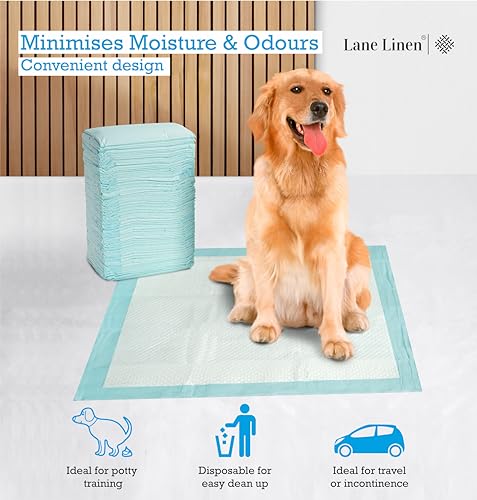 ntroducing Lane Linen Dog and Puppy Pee Pads with Leak-Proof Quick-Dry Design for Potty Training! These innovative pee pads are the ultimate solution for pet owners seeking a hassle-free and hygienic way to train their furry friends. With regular and X-large sizes available, we have the perfect fit for dogs of all breeds and sizes. Designed with convenience in mind, our pee pads feature a leak-proof layer that effectively locks in moisture, preventing any messy accidents from seeping through. Say goodbye to unpleasant odors and stubborn stains on your floors or carpets. The advanced technology in these pads ensures maximum absorbency, making them perfect for potty training, incontinence, or even as a comfortable alternative for dogs with limited outdoor access.