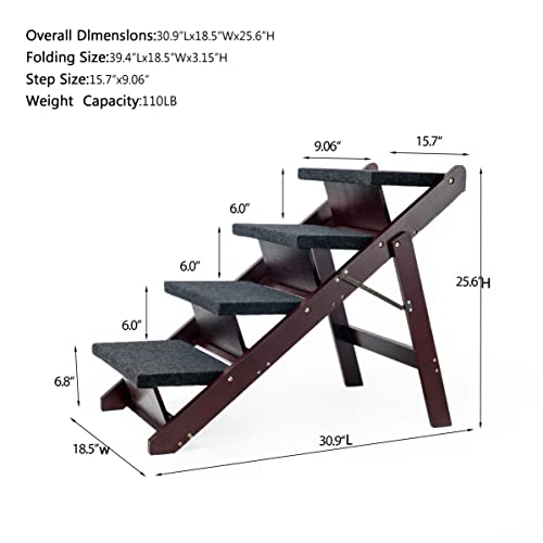 - DIMENSION: 30.9″ L x 18.5″ W x 25.6″ H; Step Size: 15.7″ x 9.06″. Pet stairs mode is perfect for Small to Large-sized pets, easy to reach sofas or beds. Pet ramp mode is very steep, so it is only suitable for cats and medium to Large-sized dogs, not for small dogs.