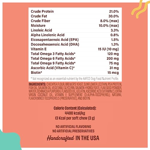 Tasty and Irresistible: We understand that giving your dog supplements should be a treat, and that’s why our Skin and Coat dog supplements come in a delicious salmon and peas flavor that dogs love. Staying healthy becomes a delightful experience for your canine best friend.