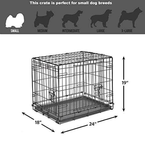 The New World folding metal dog crate by MidWest Homes for Pets includes all of the features you will need to provide a convenient, safe & secure pet home for your best friend, from puppy to adulthood. This crate includes a plastic leak-proof pan that allows easy clean-up in the event of an accident and rubber feet to protect the floors in your home. We recently enhanced the safety and security of the New World crate by adding locking tips on the slide-bolt latches to securely lock the door the and patented Paw Block, which prohibits your dog from tampering with the door lock from the inside. New World crates also feature patented rounded side clips that reduce possible sharp points to ensure a safe experience for you and your pet. Every New World metal dog crate conveniently folds down flat for travel. The 24″ New World (model B24DD) measures 24L x 18W x 19H inches and is suitable for “small” dog breeds. **Please note the term “small” breed is subjective. For the best fit, we advise that you check the measurements of the dog crate and select a size that will be suitable for your dog’s ADULT weight and measurements. Your dog should be able to comfortably sit upright, lay down, and easily turn around inside the crate. When in doubt, we suggest you purchase a larger crate option. We at MidWest Homes for Pets understand that your dog is a part of your family; that’s why we ensure our dog crates are manufactured with the highest quality control standards to create a safe and secure home for your pet. Assembly and safety instructions are included; please read all safety instructions prior to use.