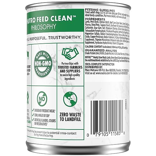 NUTRO knows that dogs are valued members of the family, and they deserve healthy, wholesome meals that nourish their lives. NUTRO HEARTY STEW Adult Natural Grain Free* Wet Dog Food Cuts in Gravy Meaty Lamb, Green Bean & Carrot Stew is a delicious wet dog food that’s rich in nutrients and full of flavor. Featuring real lamb as its first ingredient, you can trust that NUTRO wet food contains no chicken by-product meal, no corn, wheat, or soy protein, and no artificial flavors, colors, or preservatives†. As part of our pledge to pets and pet parents, NUTRO is committed to safeguarding the source of natural ingredients by working with farmers to protect and improve soil health so we can continue to grow healthy pets for years to come. *Natural Dog Food plus vitamins & minerals & other nutrients †Trace amounts may be present due to potential cross-contact during manufacturing