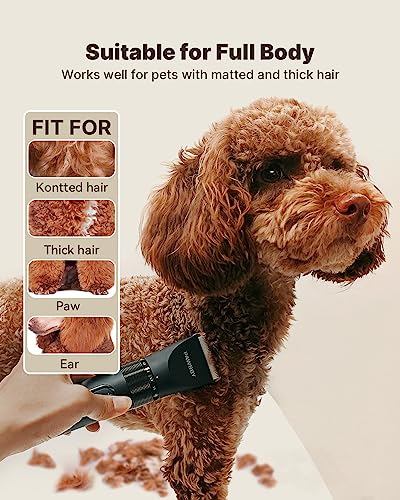 🎅🎁【Safe and Sharp Blades & Upgraded Motor】High quality stainless steel blade and ceramic movable blade cooperate to provide excellent cutting performance, easy to trim and never hurt your pet, the ceramic blade is sharper and more durable. The blade motor reaches 7000 rpm, enabling easy hair removal with no pressure on pet precious hair and no pulling or dragging. 5 adjustable blade lengths, getting the exact fur length you want.