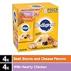 PEDIGREE CHOPPED GROUND DINNER in a variety pack with Beef, Bacon & Cheese, and Hearty Chicken delivers the flavors adult dogs crave with the nutrition they need. Your dog can enjoy the delicious taste of real beef or chicken in every bite! Our formulas provide the perfect balance of vitamins and minerals with no artificial flavor, no added sugar, and no high fructose corn syrup. Each recipe is 100% complete and balanced for canines, so you know they’re getting the most out of their diet. Serve as a topper, a mixer with dry dog food, or a complete meal. Feed your dog nutritious food for a healthy, happy life with PEDIGREE Pouches.
