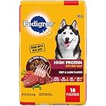Contains one (1) PEDIGREE High Protein Adult Dry Dog Food Beef and Lamb Flavor Dog Kibble, 18 lb. Bonus Bag