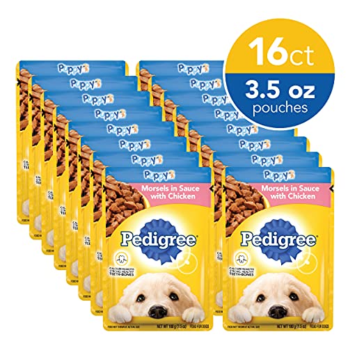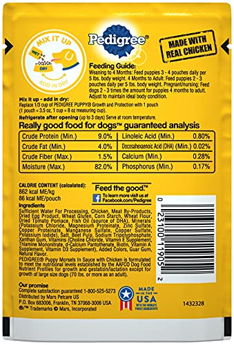 Formulated to help promote strong, healthy teeth and bones, PEDIGREE Puppy Morsels in Sauce with Chicken is the wet dog food specially designed to support growing puppies. Made with real ingredients including tasty chicken, your puppy will love this soft food as a treat, topper, as a mixer with dry puppy food, or a complete meal! Feed your puppy with confidence knowing that PEDIGREE dog food is made with DHA to help support brain development, and the necessary vitamins and minerals for a complete and balanced meal. With so many delicious flavors to choose from, PEDIGREE Puppy formulas are the great tasting way to give your precious new pup the nutrition they deserve.