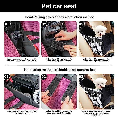 【Improve security】There is an anti escape safety buckle inside the pet seat, which is used to fix the pet’s collar to prevent it from walking around in the car and causing interference with driving.We adopt the method of fixing the pet seat on the armrest box by Velcro. You can adjust the sticking position of the armrest box according to the size of your car’s armrest box and ensure that it is tightly pasted. And We have made a non-slip design on the bottom of the seat to increase friction.