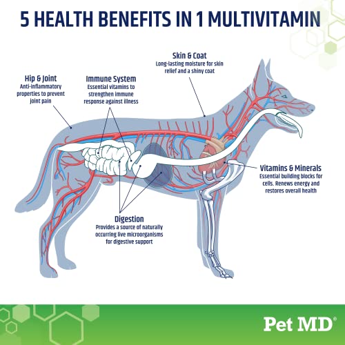 Pet MD 5-in-1 Multivitamin is a comprehensive blend of over 30 essential minerals and ingredients to support the overall health and wellness of all dogs over the age of 12 weeks. Recommended for dogs of all breeds and activity levels.