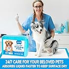 ULTRA-ABSORBENT QUICK-DRYING DOG POTTY PADS: Crafted for maximum absorption, these pads swiftly lock in up to 12 cups of liquid, ensuring dry, protected floors and carpets. Perfect for multi-pet households, their large size accommodates puppies and wandering dogs, offering rapid urine absorption and odor control for a clean, fresh environment.