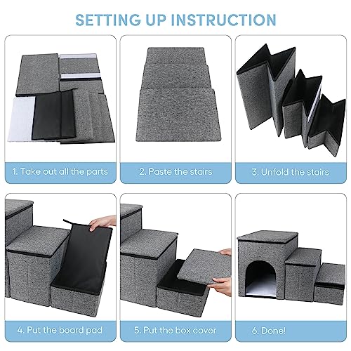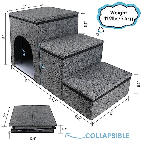 - STORAGE & CONDO – Combine the pet stairs, cozy condo and storage space in one. The first 2 steps of this pet steps are designed as a storage box, you can put dog toys, food, clothes or other pet supplies in. The third step can be used as a condo for cats or puppies.